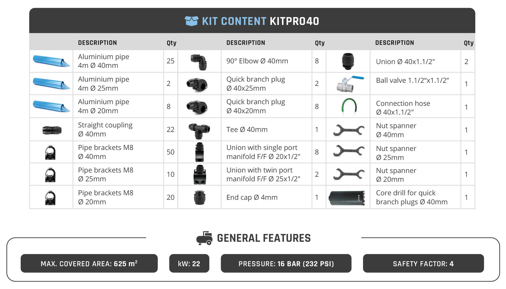 The Basic, Standard and Professional kits (Pro Kit One, Pro Kit Two & Pro Kit Three) are available in diameter sizes from 16 to 40mm, covering lengths up to 100 linear meters with a maximum of 10 drops, and come with all components necessary to assemble the piping system. Aluminum pipes come already pre-chamfered. To meet every need for customization and expansion of your piping system over the time, Piping Expansion Kits are available to increase the linear meters of piping coverage, as well as Drops Expansion Kits to implement all drops you may need.